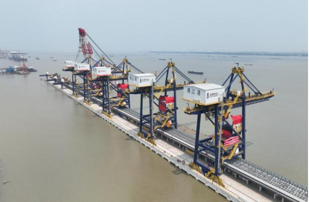 6月2日下午位于靖江经济技术开发区的深国际智慧物流中心码头5#卸船机上部结构在浮吊的精细操作下,与下部结构平稳“对接”,顺利完成拼装。