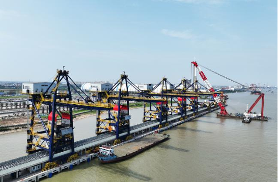 6月2日下午位于靖江经济技术开发区的深国际智慧物流中心码头5#卸船机上部结构在浮吊的精细操作下,与下部结构平稳“对接”,顺利完成拼装。