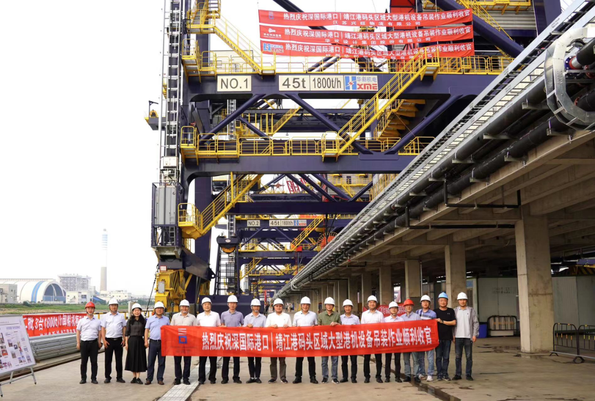 卸船机分两大件进行发运吊装,上部、下部结构对接精度要求高、吊装难度大。张家港上船时,为了尽量缩小空间,采用大梁抬起80度进行整机转运,是公司第一次采用这种方式转运。在公司团队与施工单位的共同努力下,从装船、运输到现场安装完成,最后三台卸船机共用了5天成功拼装。至此港口靖江港码头区域大型港机设备吊装作业圆满完成。